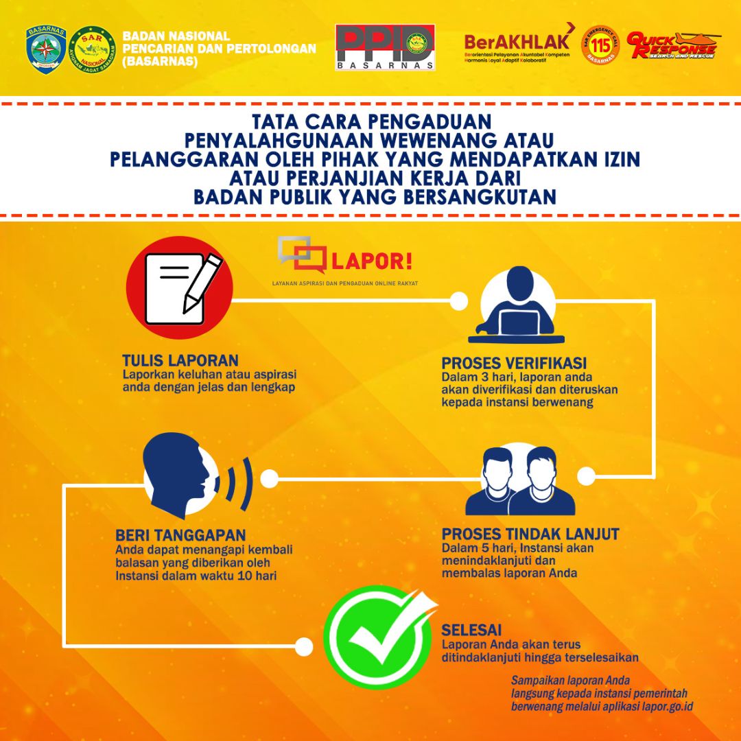 Pelayanan publik di Indonesia yang berkualitas dan berkeadilan dapat diwujudkan oleh pemerintah, salah satunya dengan melaksanakan penanganan pengaduan yang terintegrasi. Dalam mendukung hal tersebut, Basarnas turut serta dalam menyebarluaskan layanan publik terkait permintaan informasi, penyampaian aspirasi dan pengaduan layanan dengan integrasi SP4N-LAPOR!.