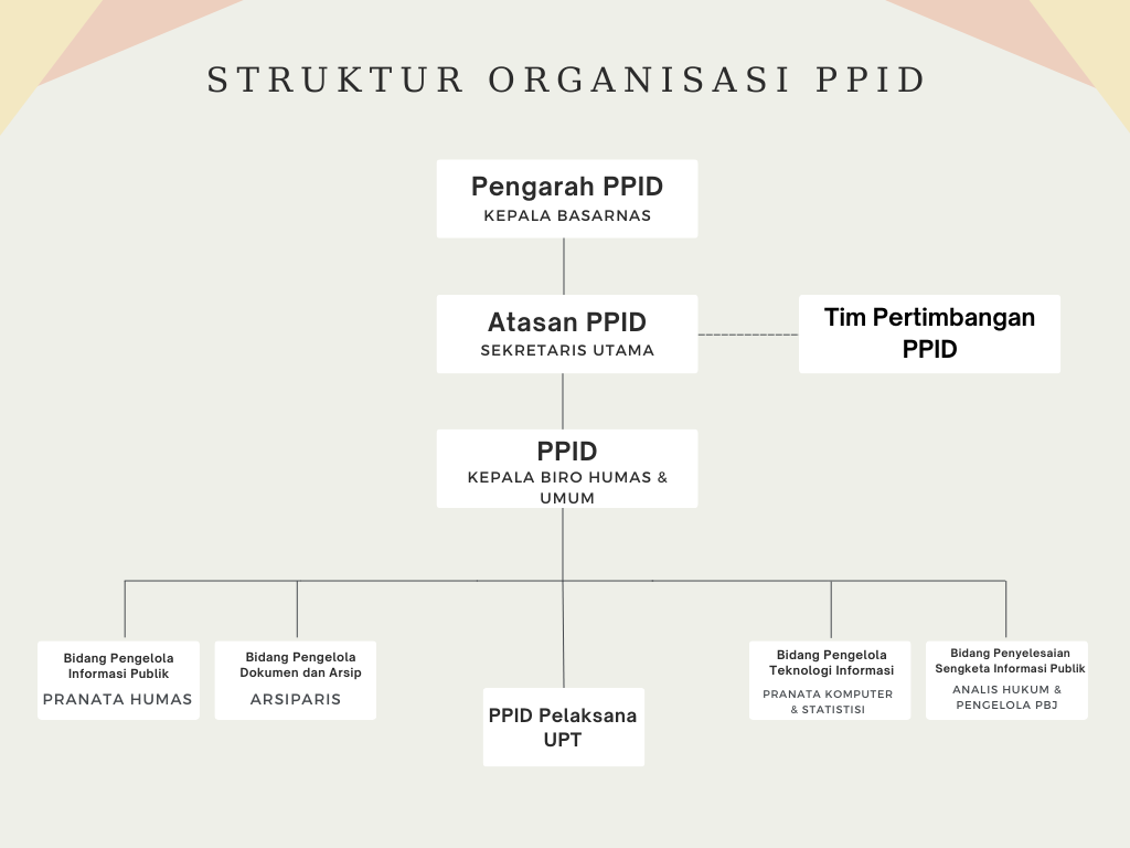 Atasan PPID Basarnas dijabat oleh Dr. Abdul Haris Achadi, S.H., DESS yang merupakan Sekretaris Utama di Basarnas. Pernah menduduki jabatan sebagai Kepala Bagian Kerja Sama Teknik Luar Negeri, Kepala Biro Bagian Hukum dan Kepegawaian Basarnas, Deputi Bidang Bina Tenaga dan Potensi Pencarian dan Pertolongan dan saat ini menjabat sebagai Sekretaris Utama Basarnas.